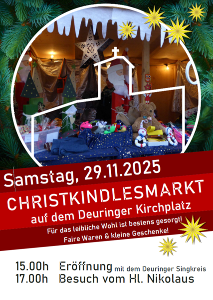 Auch in diesem Jahr verzaubert die Pfarrei St. Gabriel den Kirchplatz wieder in eine bunte, kleine Weihnachtsinsel. Am Samstag vor dem 1. Advent öffnet der traditionelle Christkindlesmarkt von 15.00 h bis 20.00 h seine Tore und lädt mit vielen Köstlichkeiten und Leckereien zum Verweilen ein. Die Eröffnung gestaltet musikalisch der Deuringer Singkreis. In den liebevoll dekorierten Buden finden Sie Gebasteltes, eingemachte Marmeladen und Liköre, selbstgebackene Plätzchen und fair gehandelte Waren. Auch für das leibliche Wohl ist mit Schupfnudeln, Reiberdatschi und Bratwürsten sowie Glühwein und Winzerpunsch gedacht. Die Ministranten backen frische Waffeln. Dazu gibt es dann fairen Kaffee.